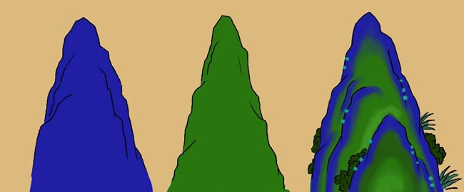 평면에 단색을 칠해도 느낌이 난다. 왼쪽 그림은 높고 먼 산의 느낌, 중간그림은 푸른 산의 느낌이다. 오른쪽은 이 둘을 결합하고 혼색과 바림질 기법을 이용하여 입체감과 공간감을 살렸다. [자료사진 - 심규섭]