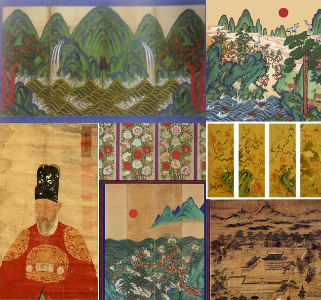 하지만 궁중회화의 대부분은 엷은 황색으로 바탕이 칠해져 있다. 경우에 따라서는 짙은 황색으로 채워져 있는 경우도 있다.