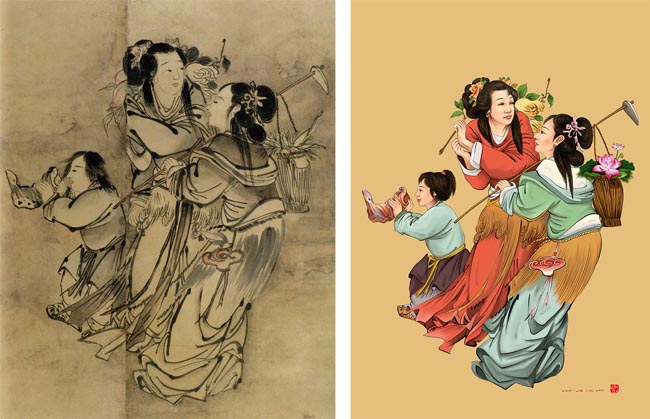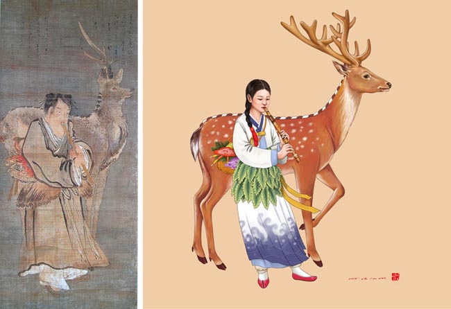 먼저는 임모를 통해 그대로 베끼는 작업을 한다. 그 후 원본그림에 충실하면서 변주하는 방식으로 발전하고 최종적으로는 새로운 작품을 창작한다. 이 그림은 김홍도의 선동취적도를 바탕으로 해서 새롭게 창작한 것이다. 세로그림인 원작을 가로로 넓혀 공간을 늘였다. 또한 남자아이는 여자아이로 바꾸고 한복과 파도문양을 추가해 신성함을 주었다. 뒤의 사슴은 크고 아름다운 꽃사슴으로 바꾸고 전체 분위기는 밝고 화사하게 만들었다.