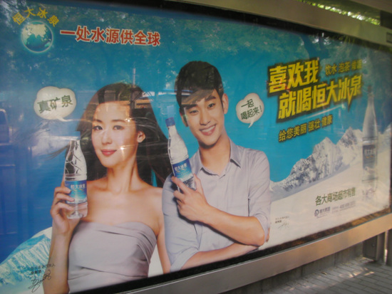 동북공정 논란으로 시끄러웠던 한류배우 김수현과 전지현의 생수광고가 중국 북경지역 곳곳을 누비고 있다. TV와 유튜브 등 동영상, 도로와 지하철의 광고판은 물론이고 2층 버스의 전체를 광고로 싸서 북경시내를 돌며 광고효과를 높이고 있다. 얼마 전 중국에 갔다 본 광경이다.