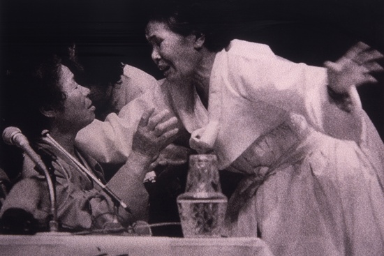 ▲1992년 12월 일본에서 열린 '전후 보상 국제공청회. 여기서 남측 김학순 할머니(오른쪽)와 북측 김영실 할머니(왼쪽)가 만났다. 두 할머니는 같은 위안소에 있던 것으로 알려졌으며, 김학순 할머니는 김영실 할머니를 만나 "위안소에 같이 있었잖아"라고 말했다. [사진제공-정대협]