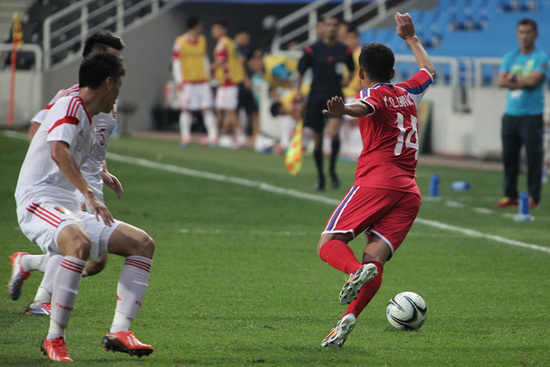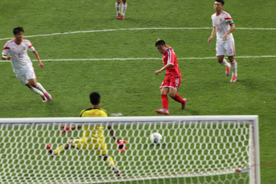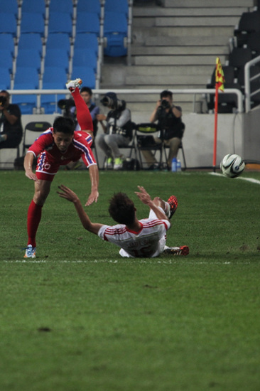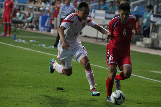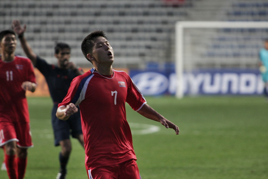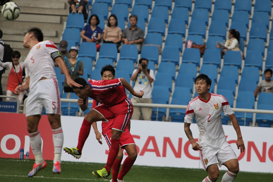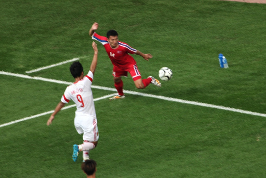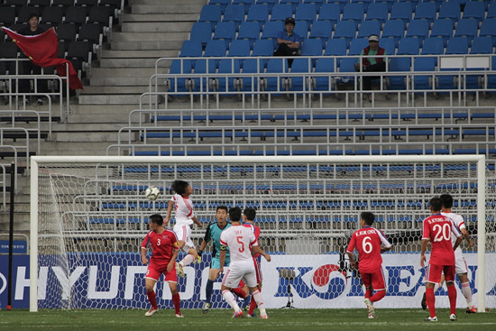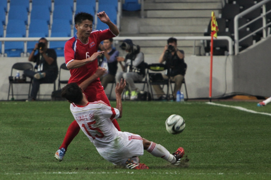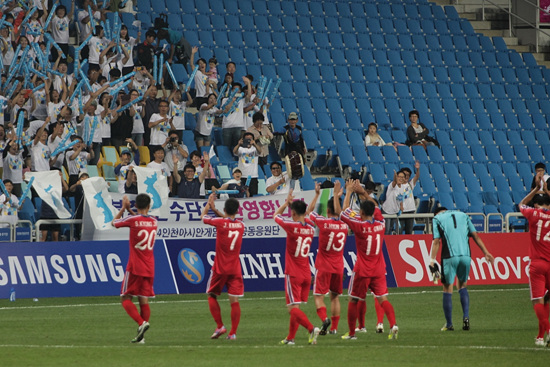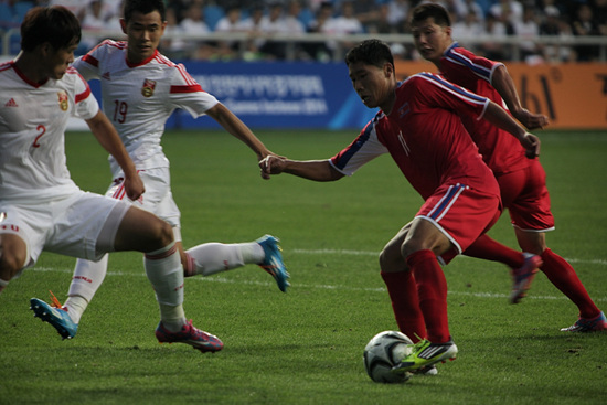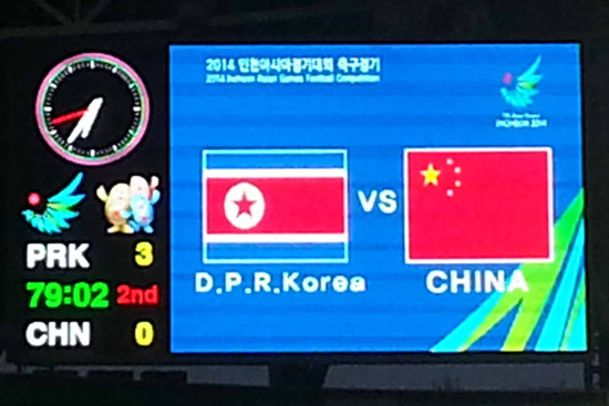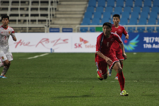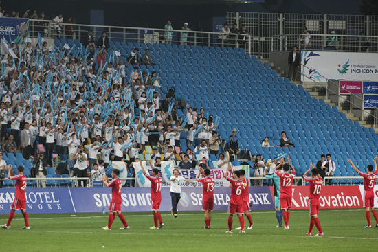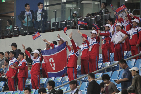 | 북측 선수단이 2014 인천아시안게임 참석차 남측에 왔다. 북측 응원단은 오질 못해 아쉽지만 선수라도 왔으니 다행이다. 북측 남자축구는 15일 오후 인천축구전용경기장에서 열린 축구 F조 예선에서 중국과 첫 경기를 치렀다. 스탠드에선 남측에 오지 못한 북측 응원단을 대신해 남측에서 모집한 ‘남북 공동응원단’이 북측을 응원했으며, 반대편에선 북측선수 대표단들이 ‘람홍색공화국기’를 들고 응원했다. 북한팀은 이날 시종일관 중국팀을 압도하면서 심현진과 서경진, 리혁철 선수가 골을 성공시켜 3대 0으로 완승을 거뒀다. 북측 남자축구팀은 이 대회의 최대 다크호스로 떠올랐다. (편집자 주) |