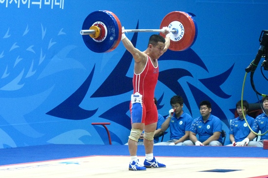 북한 엄윤철 선수는 20일 오후 7시 인천 달빛축제공원역도경기장에서 열린 남자역도 56kg급 A그룹 경기에 출전, 인상.용상 합계 298kg을 들어올려 금메달을 획득했다.