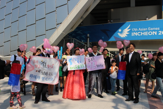 북한과 홍콩의 여자축구 예선 경기가 열린 9월 20일, 당일 결혼한 신랑, 신부가 남북공동응원 퍼포먼스를 펼쳤다.