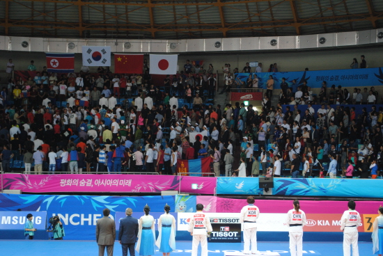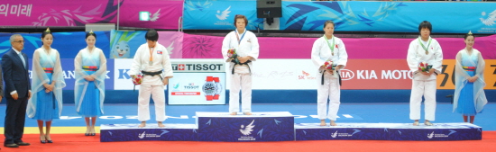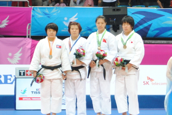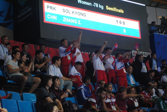22일 인천도원체육관에서 열린 2014 인천아시안게임 여자 유도 78kg급 결승전에서 맞붙은 남과 북의 승부에서 유효2개를 얻어 승리한 정경미(29, 하이원)는 은메달을 목에 걸고 시상대에서 끝내 울음을 터뜨린 북측 설경(24, 평양기계대학체육단)에게 따뜻한 위로인사를 건넸다.