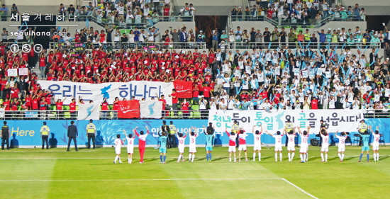전반전이 끝났을 때 북측 관계자분들이 있는 곳에 가서 플랜카드를 흔들었는데 북측 관계자분들이 일어나셔서 엄청 반가워해주셨어요. 이 때 모습이 아직도 뇌리에서 잊혀지지 않네요. 만나서 이야기 한번 나눌 수 있는 시간들이 빠른 시일 내로 올 수 있겠죠?