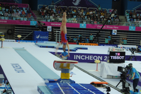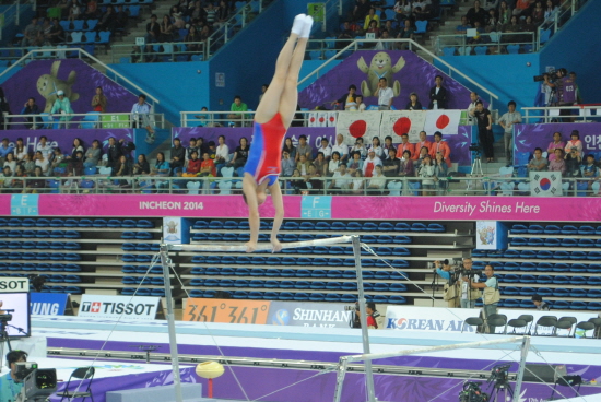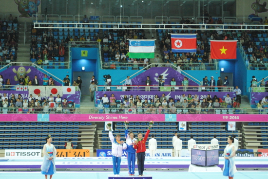 여자 도마에서 예선을 1위로 통과한 북측 홍은정은 1, 2차 시기 모두 고난도 기술과 안정적인 착지를 선보이며 최종 15.349점으로 금메달을 따냈다.