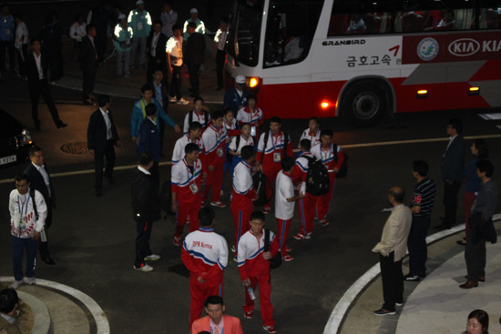 경기장을 나선 시각, 어느새 깜깜한 밤하늘이다. 북측 선수단과 관계자들이 선수촌으로 이동하기 위해 버스를 기다리고 있었다. 가장 가까이서 북측 동포들을 볼 수 있었지만 대화를 나누는 것은 불가능했기에 단일기를 들고 “우리는 하나다”를 외쳤다. 북측 동포들이 손을 흔들며 화답하는 순간, 마치 눈빛 대화가 오고 간 것만 같다.