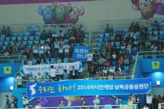 ▲ 경기장마다 빠지지 않고 나타나 '우리는 하나!'를 외치는 남북공동응원단. [사진-통일뉴스 이승현 기자]