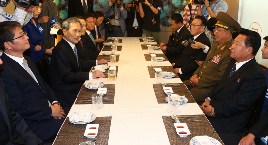 김관진 청와대 국가안보실장과 황병서 부위원장의 만남이다. 김관진 청와대 국가안보실장을 비롯한 우리측 대표단과 북측 대표단은 2시간 가까이 함께 식사를 하며 남북간 현안에 대해 ‘허심탄회한’ 대화를 나눈 것으로 전해진다.