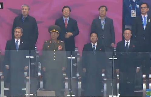 ▲ 북측 대표단은 폐막식에서 남측 애국가가 울려퍼지자 기립해 예를 갖췄다. [SBS 캡쳐사진 - 통일뉴스]