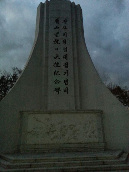 버스에서 내려 전적비 계단을 올라가니 주위는 금방 어둠으로 뒤덮이고 말았다. 확실히 산골은 해가 넘어가면 금방 어둠이 찾아온다. 우리 일행은 단체사진도 한 장 찍지 못한 채 그곳 떠나야 했다. 주위가 어두워서 지형도 제대로 살펴볼 수가 없었다. 하지만 청산리 전적비는 봉오동 전적비와 비교하면 매우 웅장하다는 사실을 알 수 있었다. 기념비에는 ‘청산리항일대첩기념비’라고 한글과 한자로 쓰여 있었고, 아래쪽 기단을 돌아가면서 항일투쟁을 형상화한 부조가 새겨져 있었다.