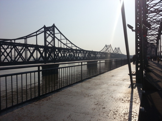 압록강 단교 옆에는 중국 단동과 북한 신의주를 이어주는 압록강 철교가 서 있었다. 중국은 이 다리를 ‘중조우의교’라고 부른다. 이 다리를 통해서 북한과 중국 사이에 대부분의 물자들(70%)이 오고간다고 한다. 이 다리 또한 일제 말기인 1943년에 건설한 것이다. 미군은 어째서 압록강 다리는 폭격했으면서 철교는 폭격을 하지 않았을까? 중국 국경일이어서 그런 것인지 아니면 아직 시간이 일러서 그런 것인지는 모르겠지만 압록강 철교를 오고가는 차량이 전혀 눈에 띄지 않았다. 우리가 구경하는 한 시간 남짓한 동안 지나는 차량을 한 대도 구경하지 못했다.