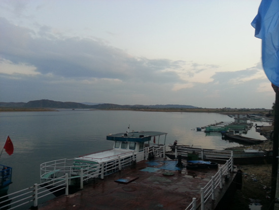 시간이 늦어서 유람선은 탈 수가 없었다. 그 대신 우리는 8명씩 탈 수 있는 작은 쾌속선을 탔다. 배는 압록강 물길을 가르며 앞에 보이는 북한 땅을 향해 한참 동안 나아갔다. 좌우의 섬도, 앞에 보이는 땅도 북한 땅이다. 우리는 북한쪽 광경을 보며 잠시 상념에 잠겼다. 이미 해는 넘어가 금방 어두워지고 있었다. 이제 배가 돌아가야 했다. 돌아오는 길, 해는 넘어가고 배가 물결을 가르며 달리자 물이 튀었다. 약간 춥다는 느낌이 들었다.