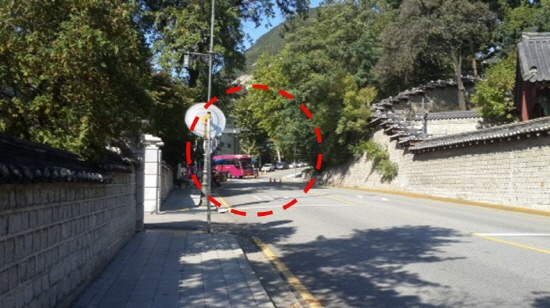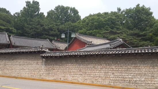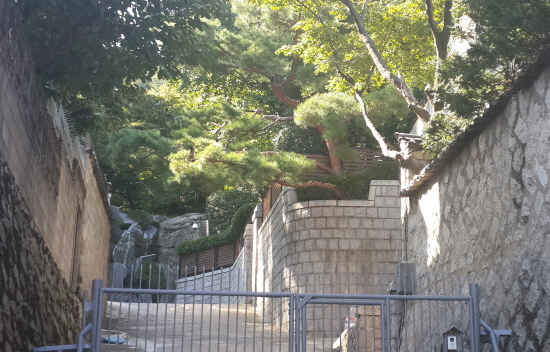 최규식경무관 동상에서부터 그가 사망한 장소, 즉 교전이 일어났던 곳(현 청운실버타운 앞)까지 내려오니 바로 옆이 청와대이다. 교전장소에서 청와대 담장 안쪽으로는 커다란 한옥, 즉 <육상궁(毓祥宮)>이 보인다. 이곳은 청와대 경내에 위치해 있기에 사전에 신고하고 허락 받아야 관람이 가능하다.