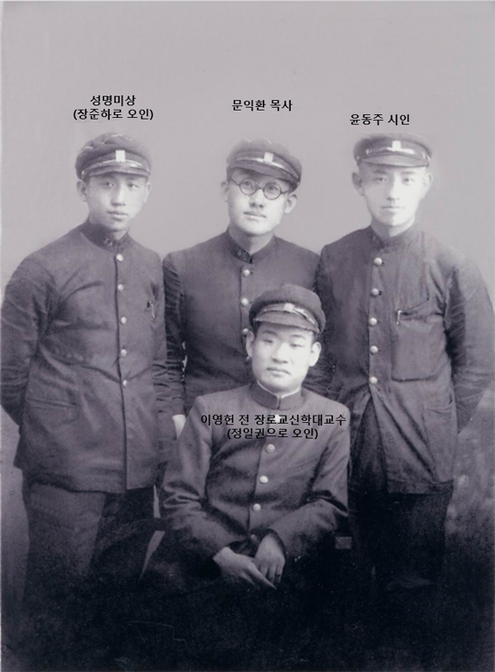위 사진은 그가 중학교 다닐 때 찍은 사진이다. 이 사진에 등장하는 인물은 여러 의견들이 있지만 최종적으로 문익환 목사의 말에 따르면, “은진중학교에서 숭실에 전학간 학생들끼리 모여서 찍은 사진”으로 앉아있는 사람은 이영헌(전 장로교신학대교수), 뒤의 왼쪽은 윤동주, 가운데는 문익환 자신, 오른쪽은 문목사도 얼굴은 기억나지만 이름이 생각나지 않는다고 하며, 장준하는 절대 아니라고 한다. 장준하는 숭실중학 동창이기는 하지만 은진중학교를 나오지 않았고, 또 앉아 있는 사람이 정일권으로 많이 알려졌는데 정일권은 훗날 윤동주, 문익환이 숭실중학교의 신사참배문제로 학교를 자퇴하고 광명중학교로 전학 가서 만난 동창생이다.