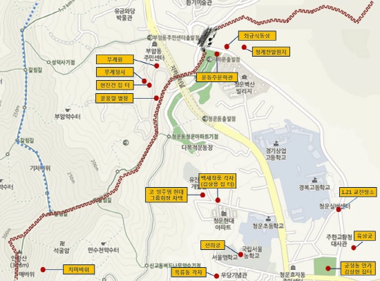 청계천 발원지임을 나타낸 표지판 옆에는 1968년 김신조 등 32명의 북한무장병이 청와대를 습격하기 위하여 이곳까지 왔다가 총격전이 벌어지면서 그 와중에 숨진 당시 종로경찰서장 최규식 동상과 정종수 순경의 순직비가 설치되어 있다. 북의 무장병이 그 해 한 겨울인 1월 18일 군사분계선을 넘어와 3일만에 능선을 타고 청와대까지 온 엄청난 사건이다.
