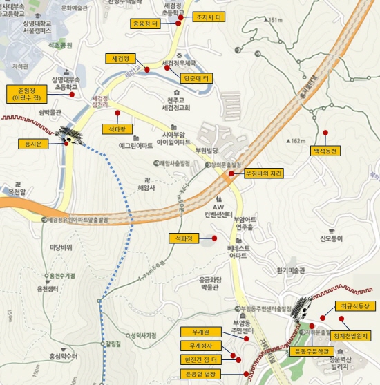 서울 도처에 여러 정자들이 있고, 나름의 이야기를 담고 있지만 세검정만큼 많은 이야기를 담고 있는 것은 그리 많지 않다. 물론 여기에 담지 못한 많은 이야기들이 더 있다. 이러한 정자이기에 비록 원형으로 존재하지 않더라도 많은 상상을 하게끔 하였던 것이다. 그럼 이제 이 세검정 옆으로 흐르는 홍제천 계곡을 따라 서울 한복판에 옛 모습을 꽤 많이 유지하고 있는 <백사실계곡>을 통해 다시 성곽으로 올라가도록 해보자.