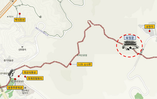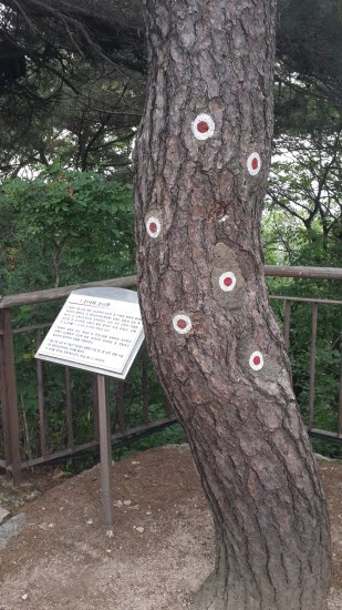 백악마루에서 이제 다시 성곽을 따라 내려가면 첫 번째로 만나는 것은 소위 <1.21사태소나무>이다. 1968년에 있었던 1.21사태에서 북의 무장병과 전투를 벌였던 흔적을 남겨 놓은 것이다. 이것의 목적은 이를 통해 국민들에게 지속적인 대북경계심을 유발시키기 위한 것이다. 좋은 말로 했을 때 '대북경계심'이고 좀 더 직설적으로 표현하면 '반북의식'이 보다 정확할 것이다. 그렇다면 여기서 과연 이러한 '반북의식'이 우리 사회에 미치는 영향에 대하여 잠시 생각해보고 떠나다.
