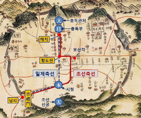 그런데 이러한 조선 한양의 축선은 일제시대에 이르러 파괴되고 변형되고 말았다. 일제는 축선을 변경시키고, 지맥을 끊었던 것이다.