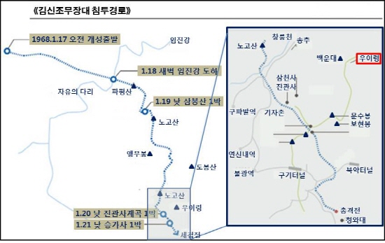 첫 번째, 북의 무장병력은 '우이령길'로 침투하지 않았다. 이들은 군사분계선을 넘은 뒤 '파주 법원리-미타산-앵무봉-노고산-진관사-북한산 비봉'을 통해 세검정, 창의문을 거쳐 청와대로 침투한 것이다. 김신조 루트라 불리는 우이령길은 정부가 밝힌 침투경로에서 동쪽으로 직선거리 약 7km나 떨어져 있는 곳이다. 우이령길은 이 무장병력이 청와대 옆에서 총격전이 벌어지고 나서 그 뒤 3명이 이쪽으로 도망쳐서 이곳 역시 총격전이 있었던 여러 곳 가운데 하나일 뿐이다. 그저 이곳은 32명의 무장병력 가운데 3명이 사살된 곳에 불과하다. 따라서 우이령길은 침투로가 아니라 굳이 말하자면 도주로 쯤 될 것이다.