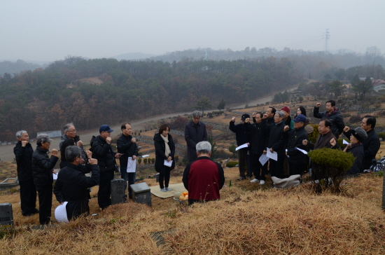 ▲ 남민전(남조선민족해방전선 준비위원회) 사건의 최고 책임자였던 이재문 선생 33주기 추모제가 22일 인천시 당하동에 위치한 천주교 공원묘지에서 열렸다. ‘임을 위한 행진곡’을 부르는 추모객들. [사진 - 통일뉴스 류경완 통신원]