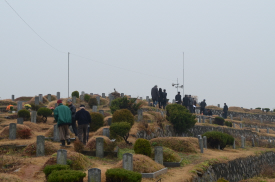 ▲ 아침에 내린 늦가을 비로 촉촉히 젖은 묘원, 예년과 달리 비교적 포근한 날씨 속에 묘소로 향하는 추모객들. [사진 - 통일뉴스 류경완 통신원]