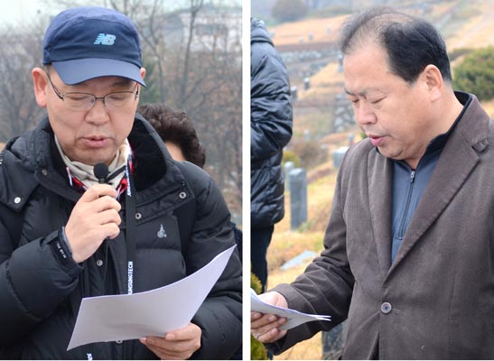 ▲ 남민전 관련자인 김경중(왼쪽), 최광운 씨가 고인의 약력 보고와 추모시 <전사 1> 낭송을 하고 있다. [사진 - 통일뉴스 류경완 통신원]