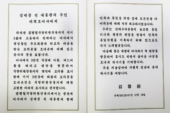 김 제1위원장은 김 위원장 3주기를 하루 지난 18일자로 작성된 친서에서 김대중 전 대통령의 부인 이희호 여사에게 김정일 국방위원장 3주기 추모화환을 보내준데 대한 감사와 내년 봄 초청의 뜻을 밝히고 "우리는 선대 수뇌분들의 숭고한 통일의지와 필생의 위업을 받들어 민족의 통일숙원을 이룩하기 위해 앞으로도 적극 노력할 것"이라고 다짐을 표시했다.