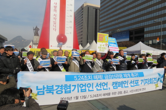 어느때보다 남북관계 개선에 대한 기대감이 커지고 있는 연초에 '5.24조치 해제를 위한 경협·종교·시민단체 연대'는 13일 오후 서울 광화문광장에서 '5.24조치 해제, 금강산관광 재개 촉구를 위한 남북경협 기업인 선언'과 이를 위한 화요캠페인을 선포하는 기자회견을 개최, 이날부터 무기한 캠페인에 돌입했다.