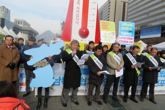 앞서 이들은 지난해 말 남-북-러시아간 3각물류 협력사업으로 진행된 '나진-하산 프로젝트'의 시범사업을 위해 정부가 '5.24조치 예외'를 선언한 것은 "남북관계가 열리던 초창기부터 남북경협의 선두주자로 헌신하다 5.24조치로 큰 희생을 치르고 있는 남북경협기업들의 피와 땀, 눈물을 외면한 채 일부 대기업에게만 특혜를 준 셈"이라고 지적했다.