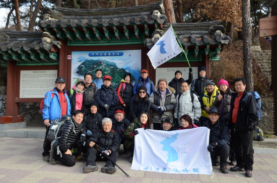 9시, 광나루역에 집결한 회원들이 반갑게 인사를 나누고 신년 산행지인 아차산 입구에서 한반도기를 높이 들고 단체 사진 촬영한 후, 정상으로 가는 팀과 아닌 팀으로 나누어 산행을 시작했다.