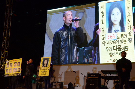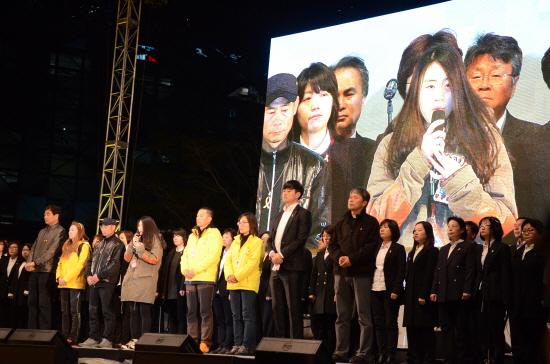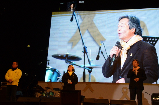 ▲ 실종자인 허다윤 양의 아버지 허흥환 씨가 연단에 올라 “아이들은 벌레가 아니라 구조를 기다렸던 사람”이라며 울먹이자 추모제 참가시민들은 “욕하고 싶으면 참지말고 하라”며 박수로 격려했고 허씨는 “사람을 버리는 국가는 필요없다. 국민 여러분 끝까지 함께 해달라”며 큰절을 올렸다. [사진 - 통일뉴스 류경완 통신원]