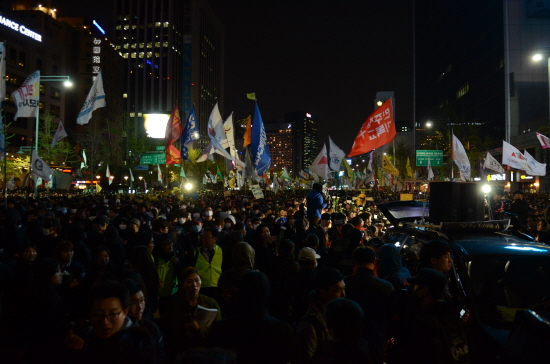 ▲ 저녁 9시 40분경 광화문 사거리 동화면세점 앞 대치상황. [사진 - 통일뉴스 류경완 통신원]