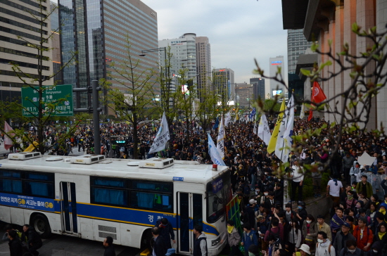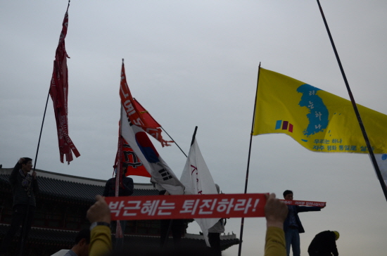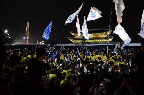 ▲ (18:46) 민주노총 본대가 2008년 광우병 집회 이후 처음으로 경찰 저지선을 뚫고 광화문 북쪽 광장으로 진입하고 있다. 광장에 함성이 인다. [사진 - 통일뉴스 류경완 통신원]