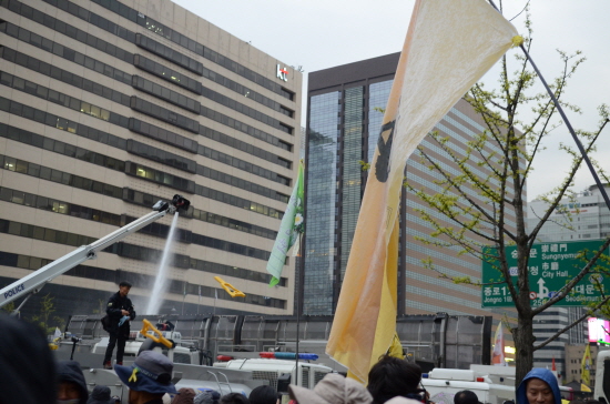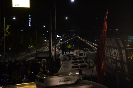 ▲ (18:41) 차단벽이 밀리자 물대포와 최루액을 무차별 난사하는 경찰. [사진 - 통일뉴스 류경완 통신원]