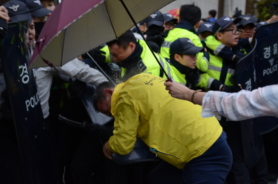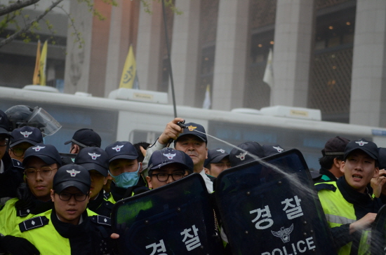 ▲ (18:42) 계속 유족 얼굴에 최루액을 직사하던 지휘관인 듯한 경찰이 취재 중인 본 기자에게까지 최루액을 쏘고 있다. [사진 - 통일뉴스 류경완 통신원]