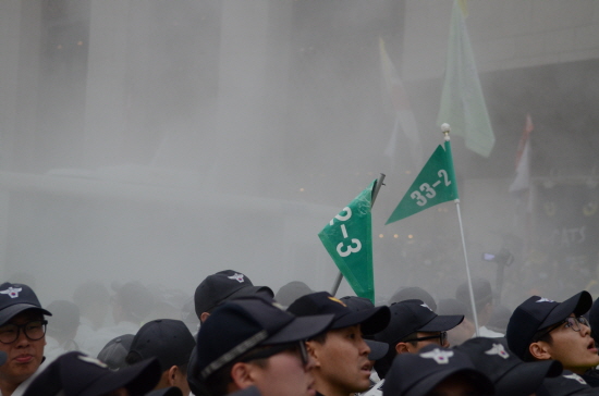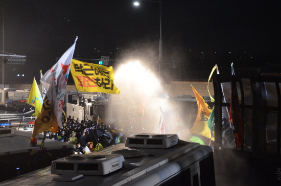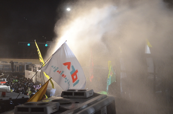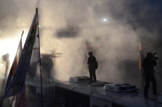 ▲ (19:42) 좁은 공간에 폭포처럼 쏟아지는 물대포와 최루액. [사진 - 통일뉴스 류경완 통신원]