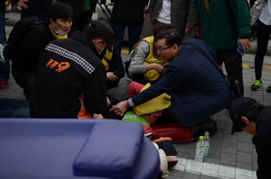 ▲ (18:28) 심장박동기를 단 한 시민이 쓰러져 구조를 기다리고 있다. 경찰차벽에 막힌 구급차는 20여 분 뒤에야 도착했다. [사진 - 통일뉴스 류경완 통신원]