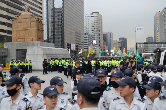 ▲ (17:54) 광화문 광장을 구역별로 차단한 경찰에 맞서 세종대왕상 앞에서 대치 중인 시위대. [사진 - 통일뉴스 류경완 통신원]