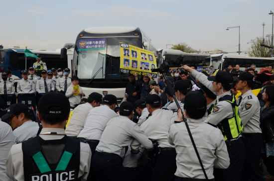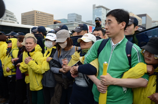 ▲ (16:52) 시민 학생들의 연행을 막기 위해 스크럼을 짠 유족들. [사진 - 통일뉴스 류경완 통신원]
