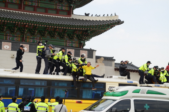 ▲ (19:09) 경찰 차벽에 오른 시위대. 차벽은 2011년 헌재에 의해 위헌 판결이 난 상태다. [사진 - 통일뉴스 류경완 통신원]