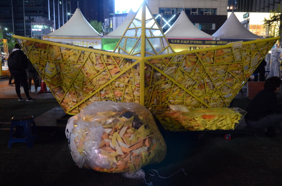 ▲ (23:30) 세월호광장 모형배를 가득 채운 노란 종이배. [사진 - 통일뉴스 류경완 통신원]