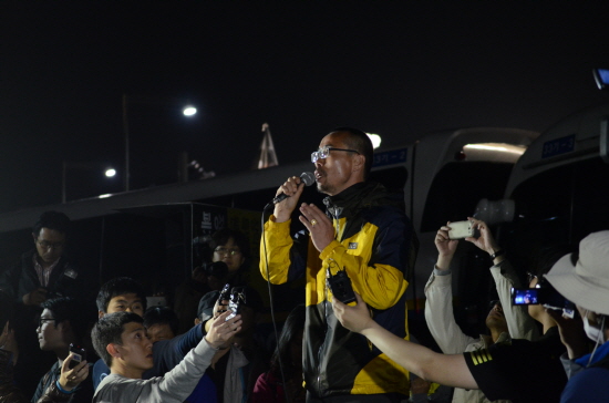 ▲ (22:48) 경찰과의 협상 끝에 광화문에 고립된 유족과 시민들이 북쪽 광장으로 나온 후 마무리 집회 발언을 하는 세월호가족협의회 전명선 운영위원장. “오늘 희망을 보았습니다. 이렇게 계속 두드리면 언젠간 답이 나올 것입니다. 안전하고 인간의 존엄이 지켜지는 사회, 국민과 가족이 함께, 우리가 직접 그 답을 만들 것입니다.” [사진 - 통일뉴스 류경완 통신원]