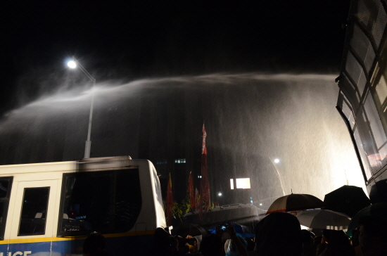 ▲ (18:44) 상황이 다급해지자 시위대의 머리 바로 위에서 물대포를 쏘는 살수차. [사진 - 통일뉴스 류경완 통신원]