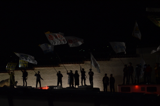 ▲ (22:00) 맞은 편 광화문 차벽 위의 유족과 시위대. [사진 - 통일뉴스 류경완 통신원]