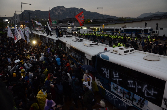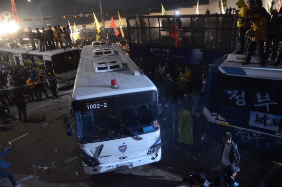 ▲ (19:38) 버스 차벽을 끌어내는 시위대. [사진 - 통일뉴스 류경완 통신원]