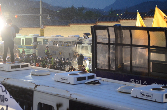 ▲ (20:35) 물대포를 지켜보는 차벽 위의 취재진과 시위대. 이날 경찰은 버스 위의 취재진에도 물대포를 조준 발사했다. [사진 - 통일뉴스 류경완 통신원]