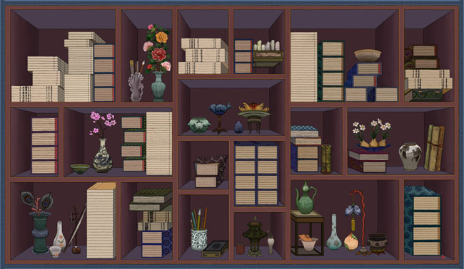 책장은 짙은 갈색으로 채색하여 차분하고 엄격해 보인다. 또한 반듯하게 정렬된 책과 세밀하게 표현한 각종 기물은 한 치의 흐트러짐도 허용하지 않는다.