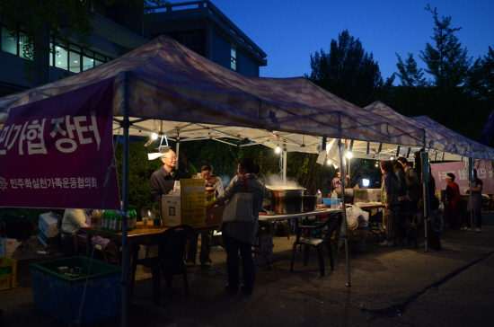 ▲ 올해 창립 30주년을 맞은 민주화실천가족운동협의회(이하 ‘민가협’) 장터가 지난 13일 오월제 축제가 진행 중인 서울대 교정에서 열리고 있다. [사진 - 통일뉴스 류경완 통신원]▲ 매년 5월과 10월 축제에 사흘씩 장터를 여는 민가협. 왼쪽은 늘 수불을 책임지는 장기수 양원진 선생(87세). [사진 - 통일뉴스 류경완 통신원]▲ 음식을 조리하는 민가협 조순덕 상임의장. [사진 - 통일뉴스 류경완 통신원]▲ 장터에 응원 온 이규재 범민련 의장과 통일광장, 4월혁명회 등의 원로 선생들. [사진 - 통일뉴스 류경완 통신원]▲ 학생들의 오월제 축제. 강산이 세 번 바뀌며 김태훈, 황정하 열사 등이 산화해간 역사의 공간 아크로폴리스 광장도 숲이 우거졌다. [사진 - 통일뉴스 류경완 통신원]▲ 싱그러운 청춘! [사진 - 통일뉴스 류경완 통신원]▲ 대학본부 옆 장터 전경. 바로 밑에서는 전철연과 유가협 장터도 연간 활동경비 수입을 놓고 선의의 경쟁을 벌인다. [사진 - 통일뉴스 류경완 통신원]▲ 부산에서 ‘욕쟁이 할매’로 통하는 전설적인 거리의 투사 정정수 어머님(81세). 손주뻘 학생들에 먹일 만두를 정성스레 담고 있다. [사진 - 통일뉴스 류경완 통신원]▲ 난지도로 의정부로 닭장차에 실려 버려져도 꿋꿋이 돌아온 30년 가까운 싸움 속에서 ‘누구의 엄마’가 아닌 투사로 거듭난 어머니들. 왼쪽부터 유선근, 윤달임, 김정숙 어머니. [사진 - 통일뉴스 류경완 통신원]▲ 어머니들의 정성이 담긴 떡볶이. [사진 - 통일뉴스 류경완 통신원]▲ 이정임, 유민호 어머니. [사진 - 통일뉴스 류경완 통신원]▲ 범민련과 코리아연대 젊은 회원들. [사진 - 통일뉴스 류경완 통신원]▲ 30년 간 학생들의 구성과 취향이 바뀌어도 민가협 메뉴는 그대로이다. 송무호 민주화운동정신계승국민연대 이사장과 리정애 회원. [사진 - 통일뉴스 류경완 통신원]▲ 대학 새내기들과 함께 선 민가협양심수후원회의 산 증인 정정수, 조순덕, 권오헌 선생. [사진 - 통일뉴스 류경완 통신원]▲ 대학본부 앞 잔디밭의 축제 현장. [사진 - 통일뉴스 류경완 통신원]▲ 어둠이 내리고, 굴뚝 연기 오르는 옛 고향집처럼 고즈넉한 장터. 이 땅의 모든 어머니들에게도 평화와 안식을! [사진 - 통일뉴스 류경완 통신원]▲ 마지막 웃음꽃으로 장터의 하루가 저문다. [사진 - 통일뉴스 류경완 통신원]▲ 학교 진입로 4.19동산에 작년 서울대민주동문회가 기념식수한 열사의 나무. 최근 재심 무죄로 복권된 인혁당 김용원(민족의 나무), 신향식(통일의 나무), 남조선해방전략당 권재혁(민주의 나무) 선생과 안치웅(정의의 나무, 국제경제 ’82, ’88년 실종) 열사를 기리며! [사진 - 통일뉴스 류경완 통신원]
